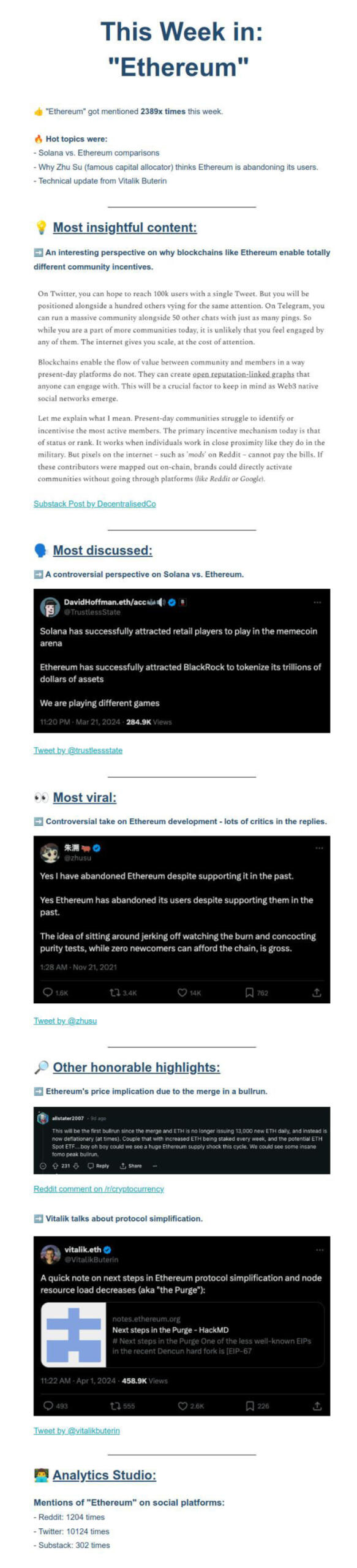 We monitor crypto's most important platforms.Reddit, Twitter (X) and Substack.So you'll never miss an important mention.